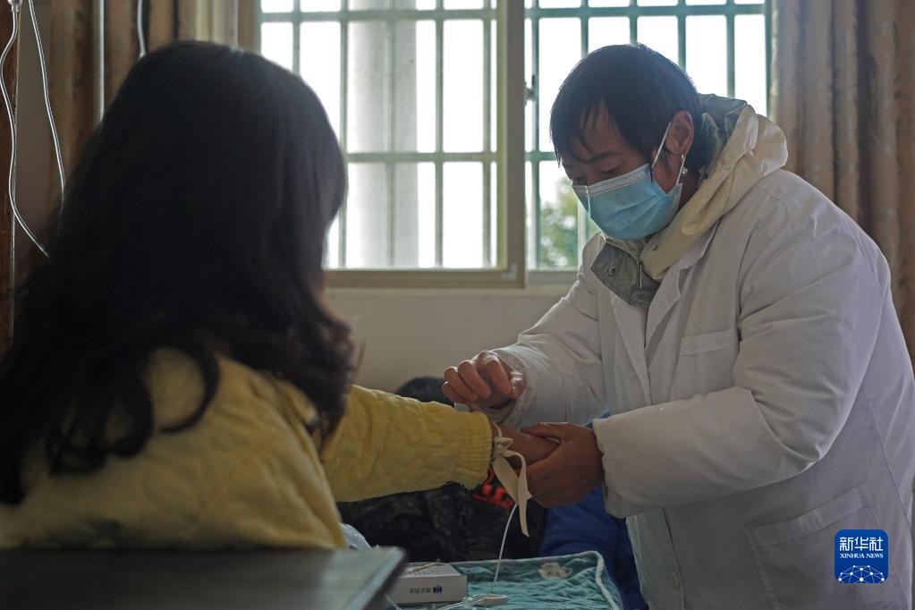 在江西省豐城市鐵路鎮楊坊村衛生所,村醫徐秋生女兒徐柳珍給患者打吊針(1月11日攝)。