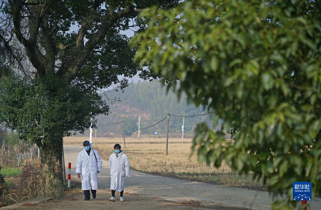在江西省豐城市鐵路鎮楊坊村,村醫徐秋生(左)與女兒一同前往行動不便的徐全香老人家中巡診(1月11日攝)。