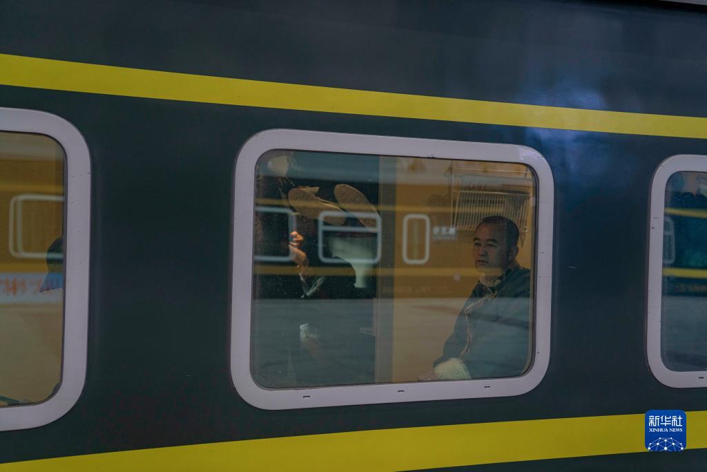 在拉薩火車站,黃起崗等待回家的火車發車(1月16日攝)。