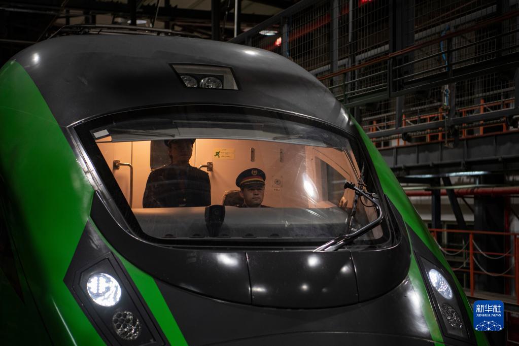 在拉薩機輛整備中心,黃起崗(右)和同事將動車組駛入停車位置(1月11日攝)。