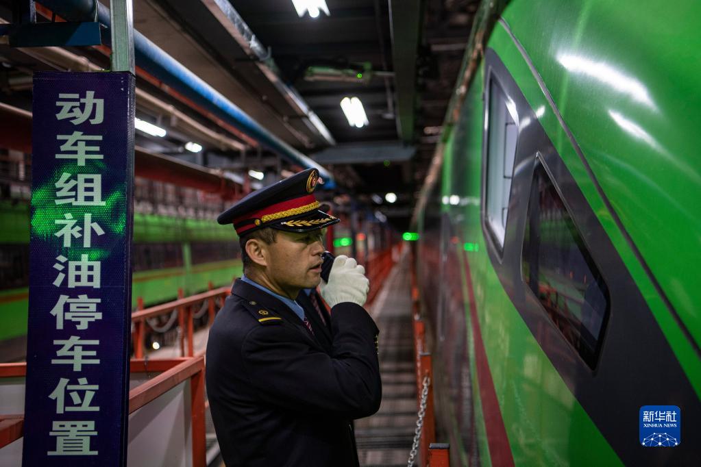 在拉薩機輛整備中心,黃起崗在和一體化調度中心確認動車組補油位置(1月11日攝)。