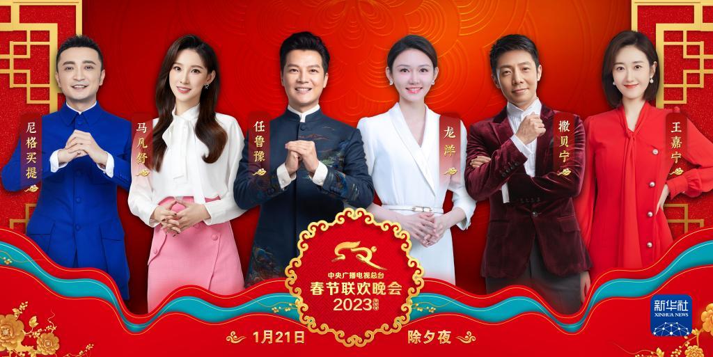 2023年春晚主持人陣容公布:任魯豫、撒貝寧、尼格買提、龍洋、馬凡舒、王嘉寧。這是宣傳海報。