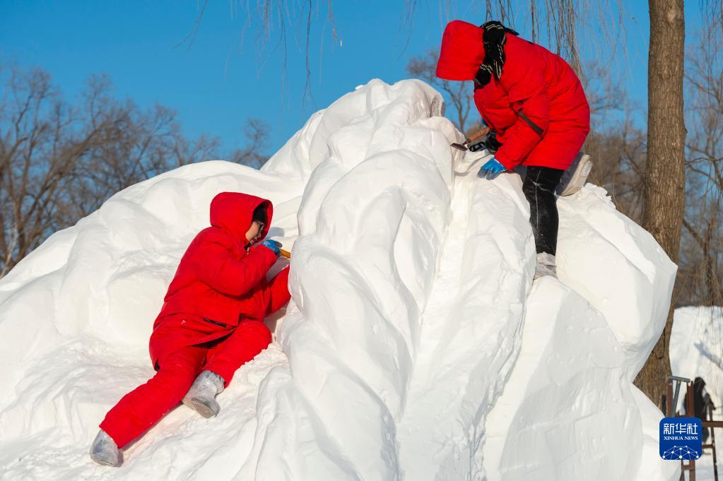 當日,在“冰城”哈爾濱市太陽島雪博會園區內舉行的第二十九屆全國雪雕比賽進入第二個比賽日,來自國內15支隊伍的數十名雪雕高手在賽場上比拼技藝,不少參賽雪雕作品已初見雛形。