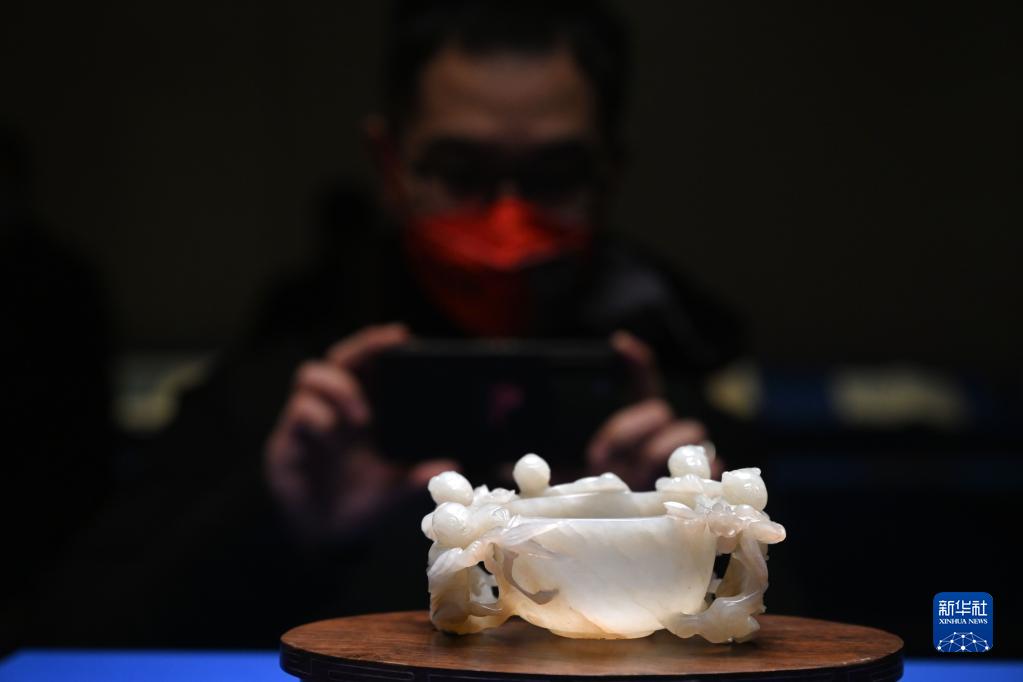 這是展出的青玉鏤雕五子登科洗(1月16日攝)。