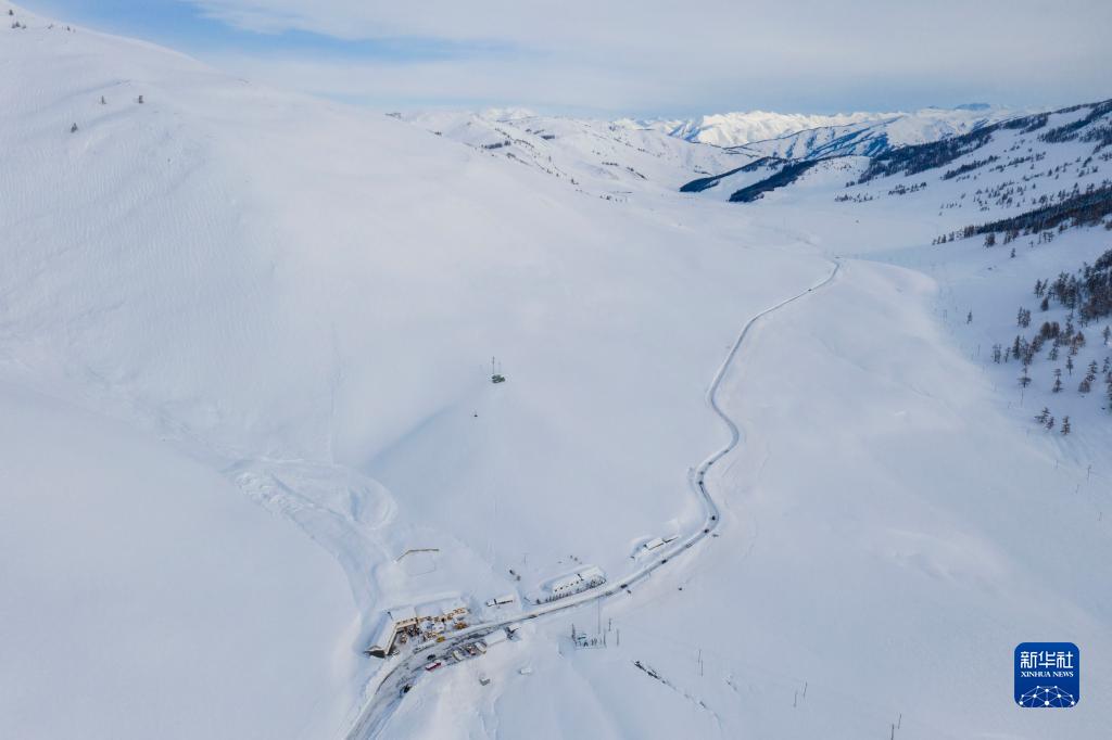 駛向新疆阿勒泰地區禾木村的車輛通過石頭房子應急救援站(1月15日攝,無人機照片)。該應急救援站全天候待命守護通向村莊唯一的公路。