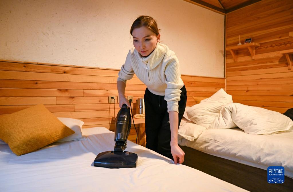 新疆阿勒泰地區禾木村的一名民宿經營主在整理客房(1月7日攝)。