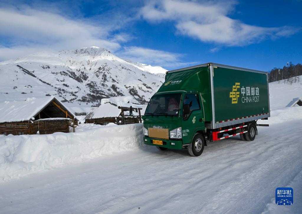 一輛郵政快遞車駛入新疆阿勒泰地區禾木村(1月14日攝)。