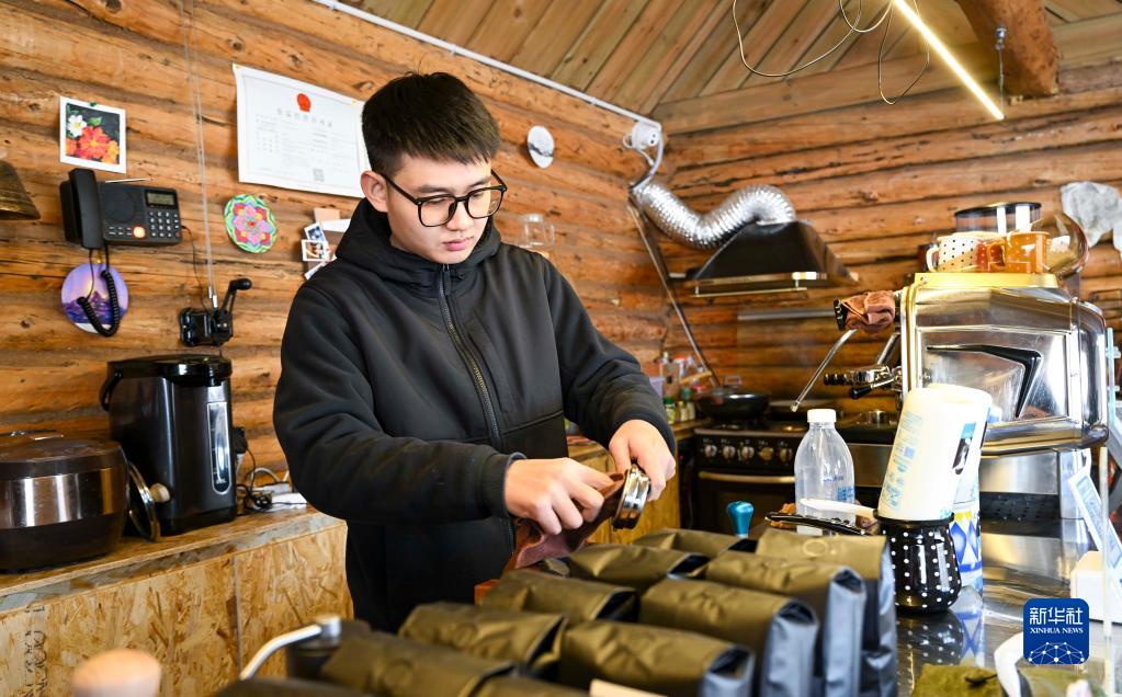 在新疆阿勒泰地區禾木村的一家咖啡店,來自天津的店長李沛安為顧客制作咖啡(1月13日攝)。