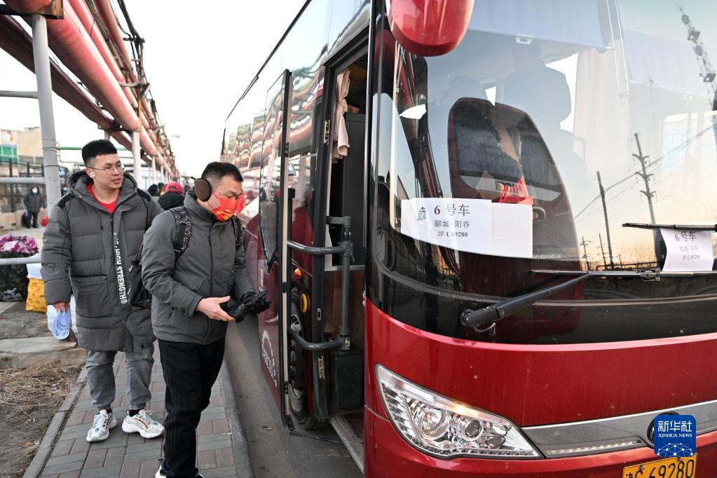 1月16日,返鄉工人在天津市北辰區宜興埠鎮登車。