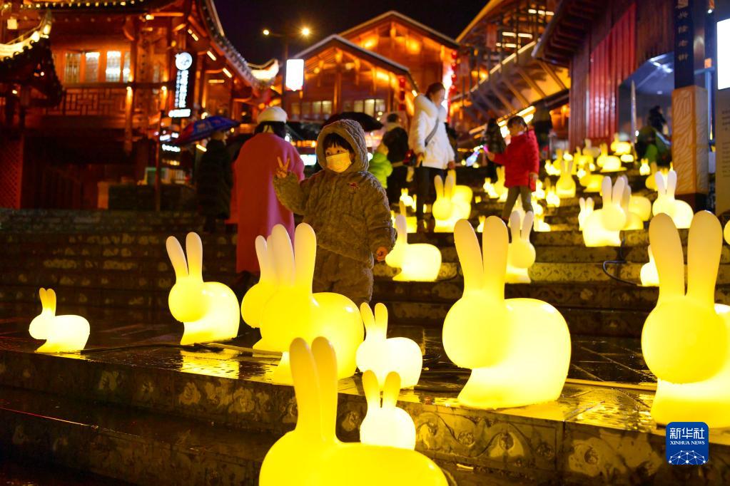 1月15日晚,人們在湖北省恩施土家族苗族自治州宣恩縣城貢水河畔觀賞兔元素彩燈。