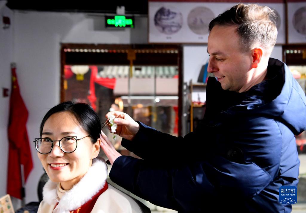 1月13日,在洛陽市洛邑古城一家非遺體驗館內,喬丹為妻子范夢佳佩戴簪花。