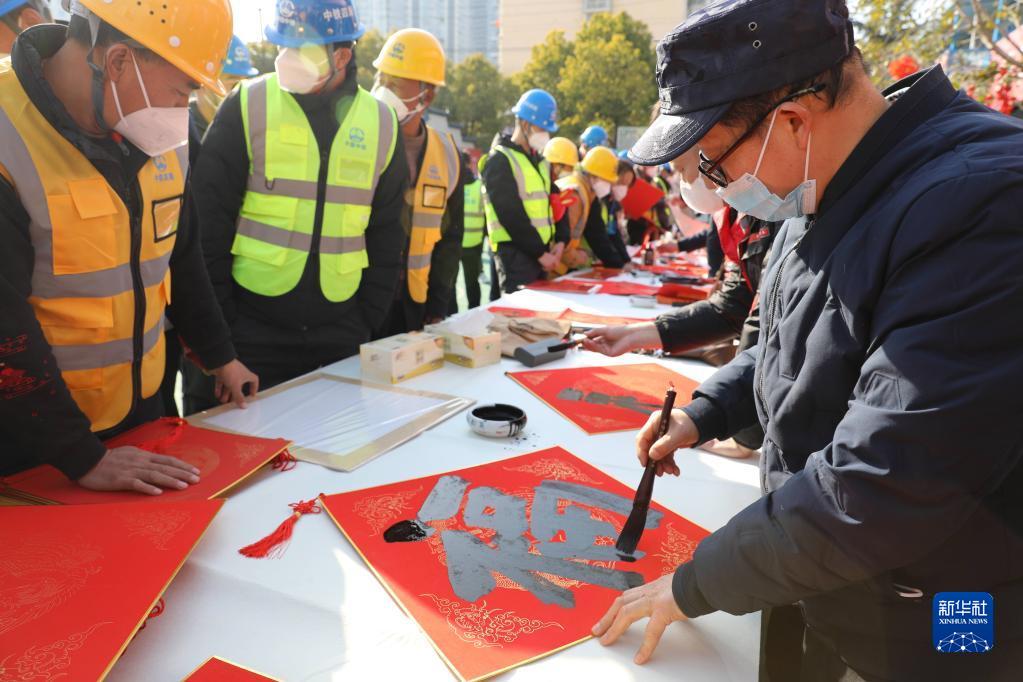 春節臨近,多地組織書法志愿者走進社區、工地等場所,為人們書寫春聯和福字,迎接春節的到來。
