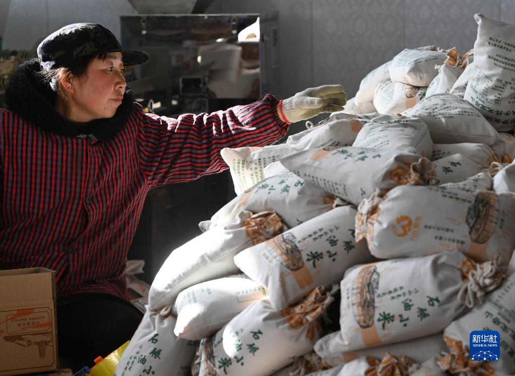 1月15日,陜西延安寶塔區河莊坪鎮一家農業科技有限公司的工人在倉庫包裝小米。