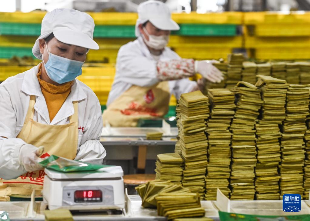 1月16日,陜西延安甘泉縣一家食品公司的工人在車間對原味豆干進行稱重包裝。