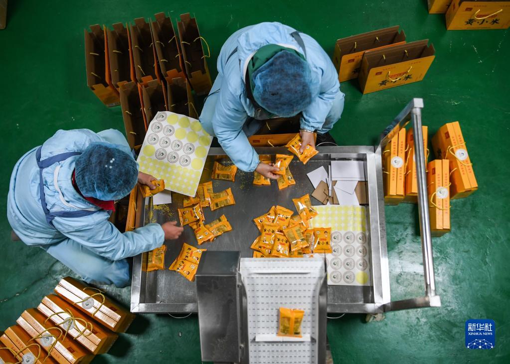 1月16日,陜西延安安塞區一家食品廠的工人在包裝小米。