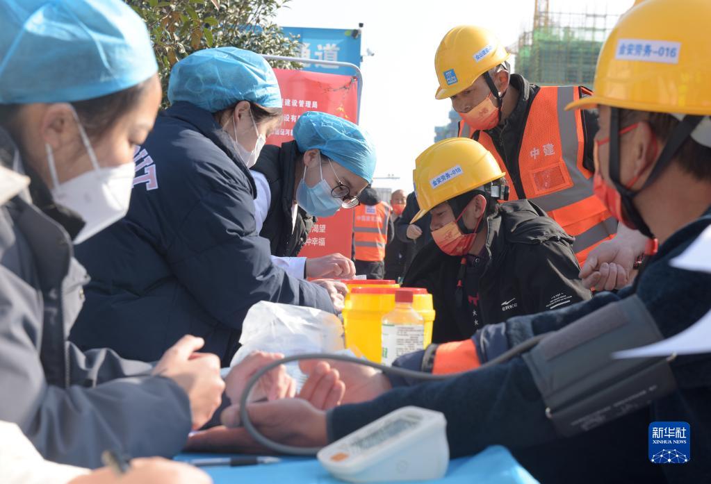 1月16日,醫護人員為即將返鄉的中建四局六公司的工人進行健康體檢。