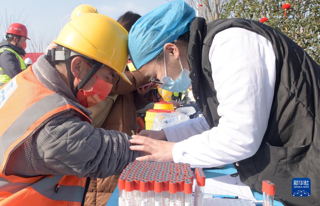 1月16日,醫護人員為即將返鄉的中建四局六公司的工人進行健康體檢。