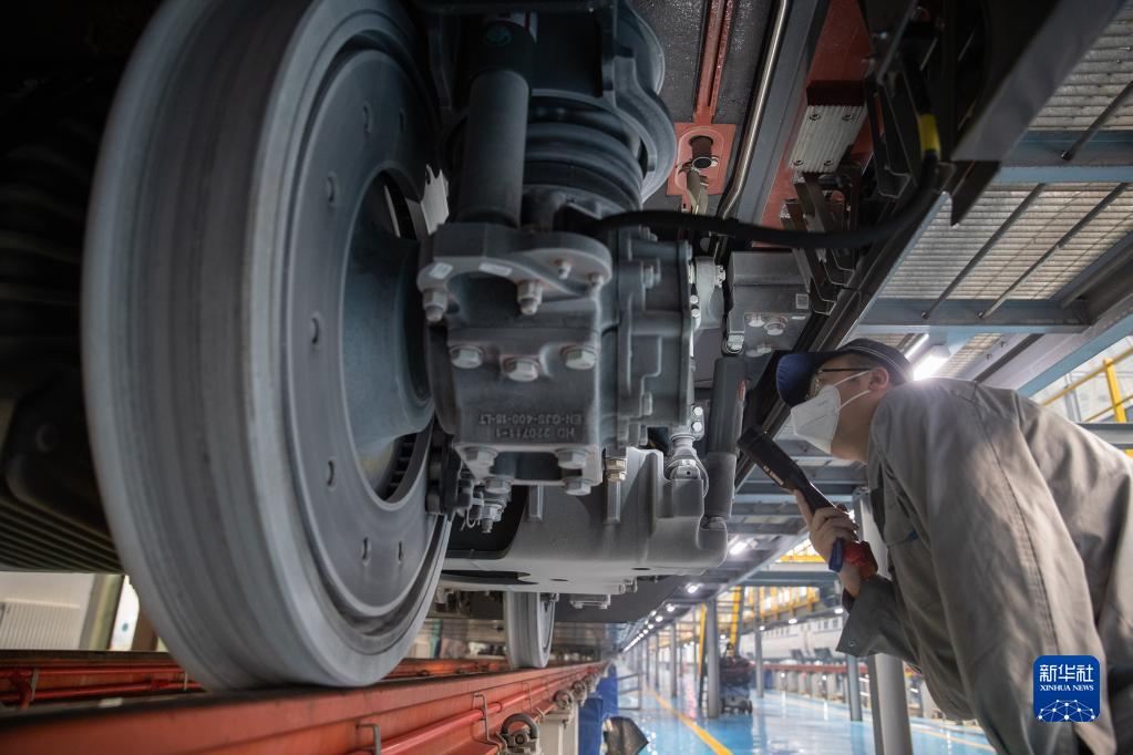 1月16日,在中國鐵路哈爾濱局集團有限公司哈爾濱動車段檢修車間內,工作人員對入庫的CR400BF-GZ型復興號高寒智能動車組進行檢修作業。