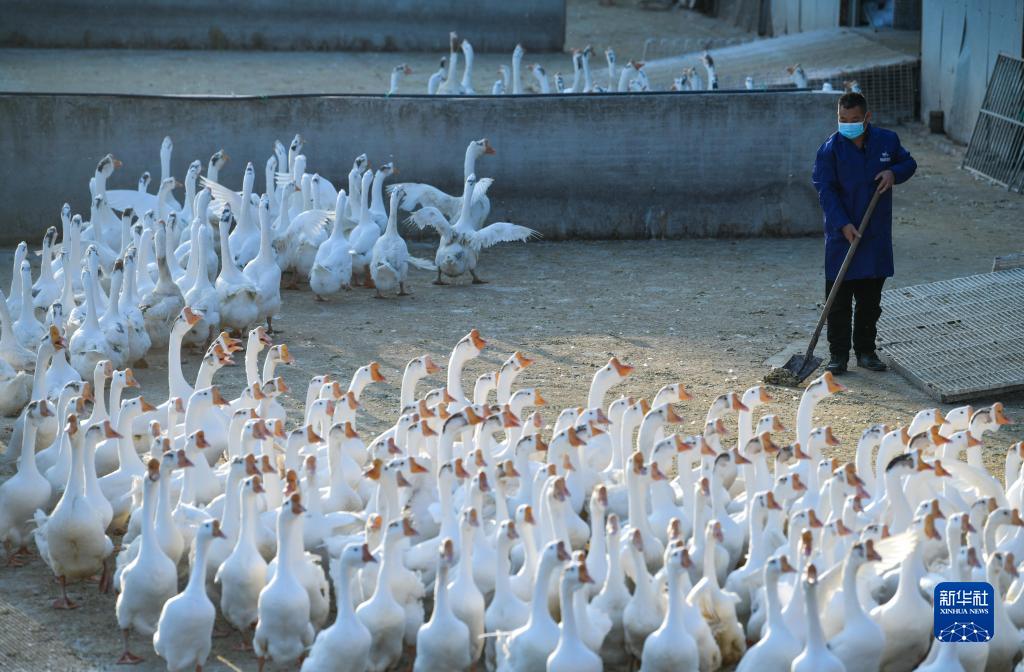 工人在貴州省錦屏縣銅鼓鎮馬臺生態種鵝養殖基地清掃鵝舍(2022年12月19日攝)。