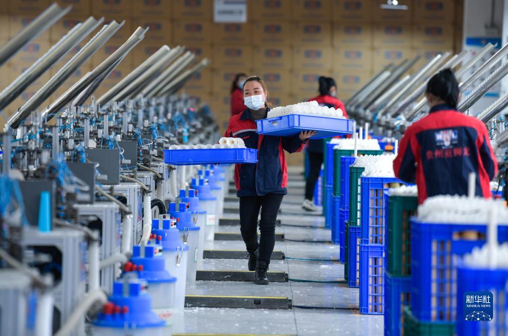 在錦屏經濟開發區貴州亞獅龍體育文化產業發展有限公司羽毛球生產基地,工人搬運羽毛球(2022年12月19日攝)。