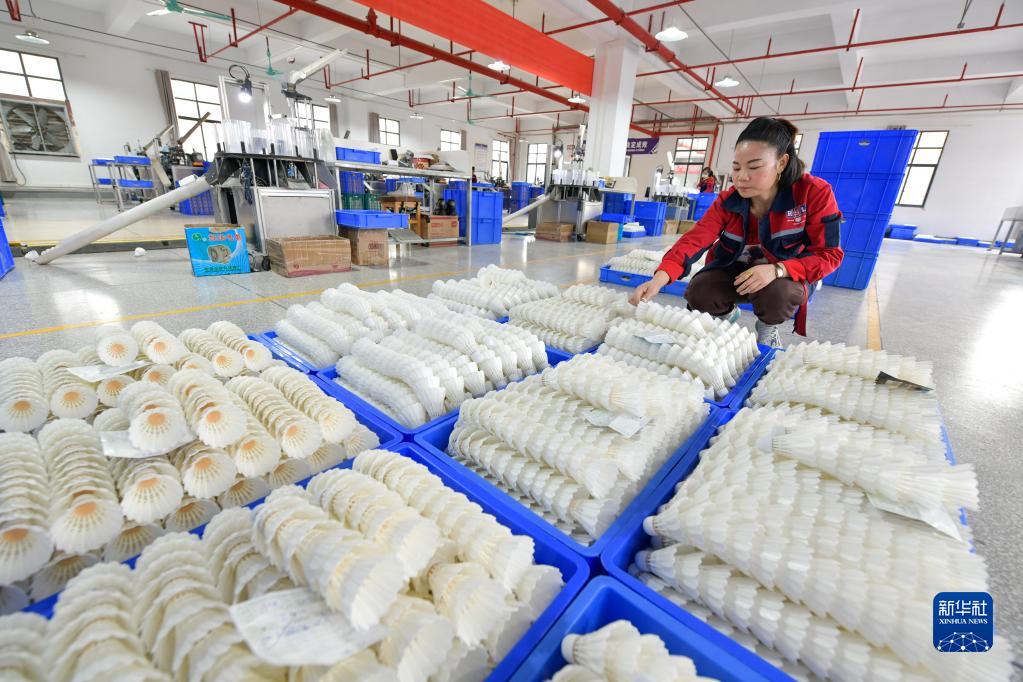 在錦屏經濟開發區貴州亞獅龍體育文化產業發展有限公司羽毛球生產基地,工人檢查羽毛球成品(2022年12月19日攝)。