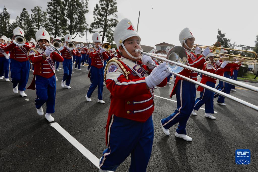 1月16日,在美國洛杉磯,學生參加馬丁·路德·金紀念日游行時吹奏樂器。