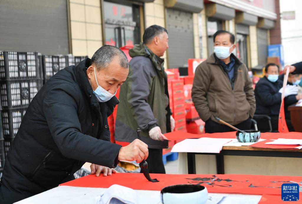 1月16日,陜西省西安市臨潼區神東村書法愛好者在村委會舉辦的年貨節上為村民撰寫春聯。