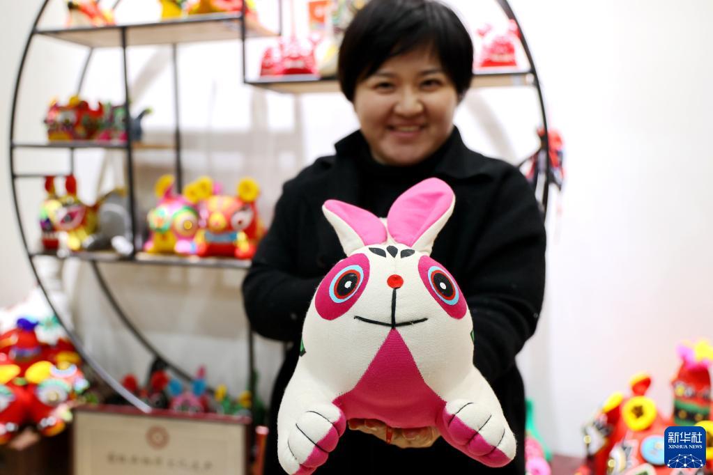 1月16日,手工藝人在山東省濱州市濱城區彭李街道的一家手工藝坊展示布藝兔。