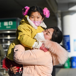 1月16日,在蘭州火車站西出站口,一位女士帶著孩子翹首以盼丈夫出站。