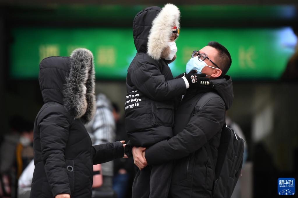 1月16日,在蘭州火車站西出站口,一位女士帶著孩子與丈夫重逢,丈夫抱起孩子,其樂融融。新華社記者 陳斌 攝