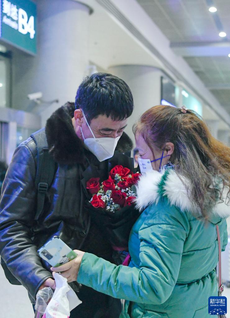 1月16日,在成都東站出站口,市民王女士迎接從沈陽乘車抵達的丈夫,為他送上鮮花。新華社記者 胥冰潔 攝