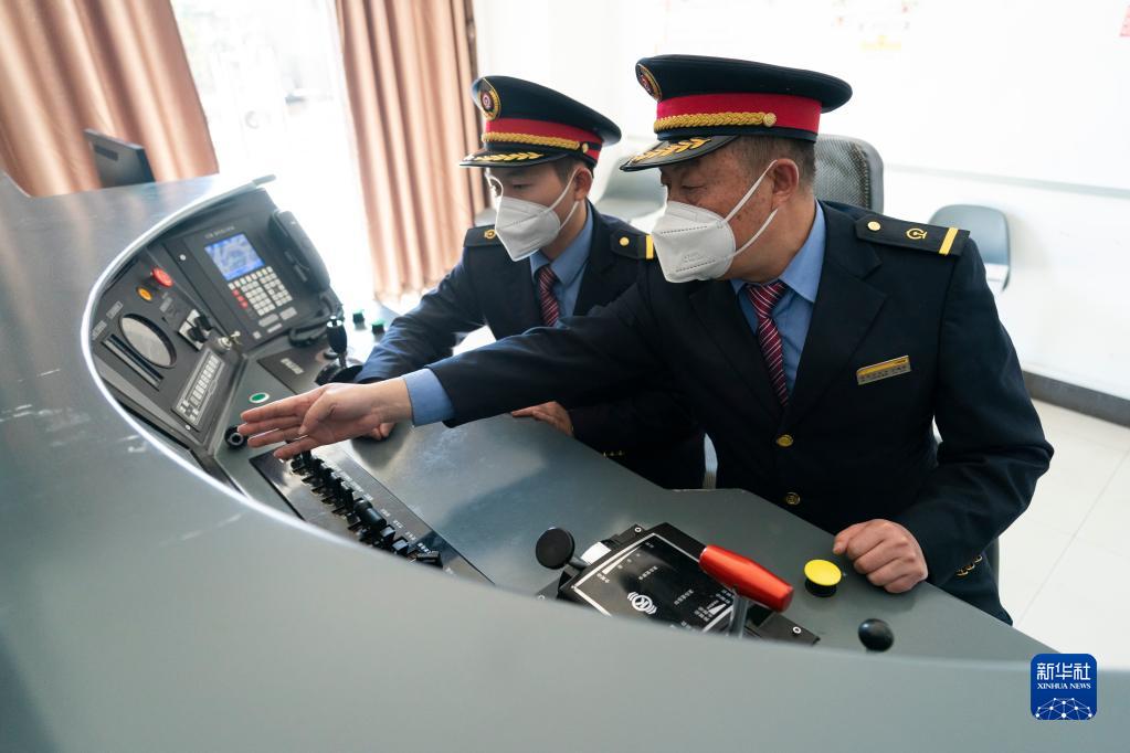 1月15日,丁建華(右)在火車模擬駕駛設備前為徒弟姜庭瑞進行講解。