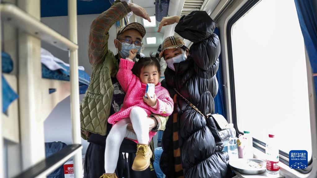 1月16日,在開往冊亨的綠皮火車臥鋪車廂,返鄉的一家三口在車上合影。