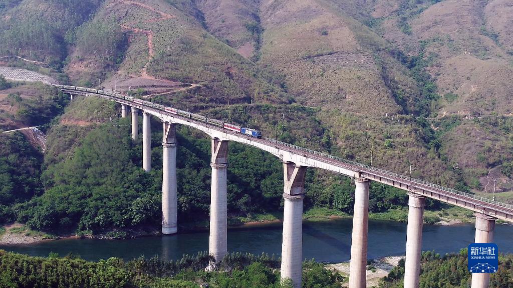 1月16日,一列綠皮火車經過八渡南盤江鐵路橋開往冊亨站(無人機照片)。