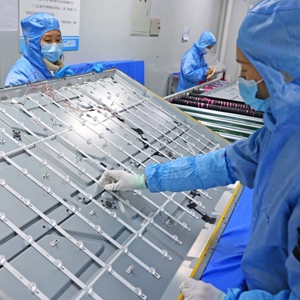 1月17日,在江蘇連云港市灌南縣高新技術產業園內一家電子科技公司,工人組裝交互式智慧黑板。
