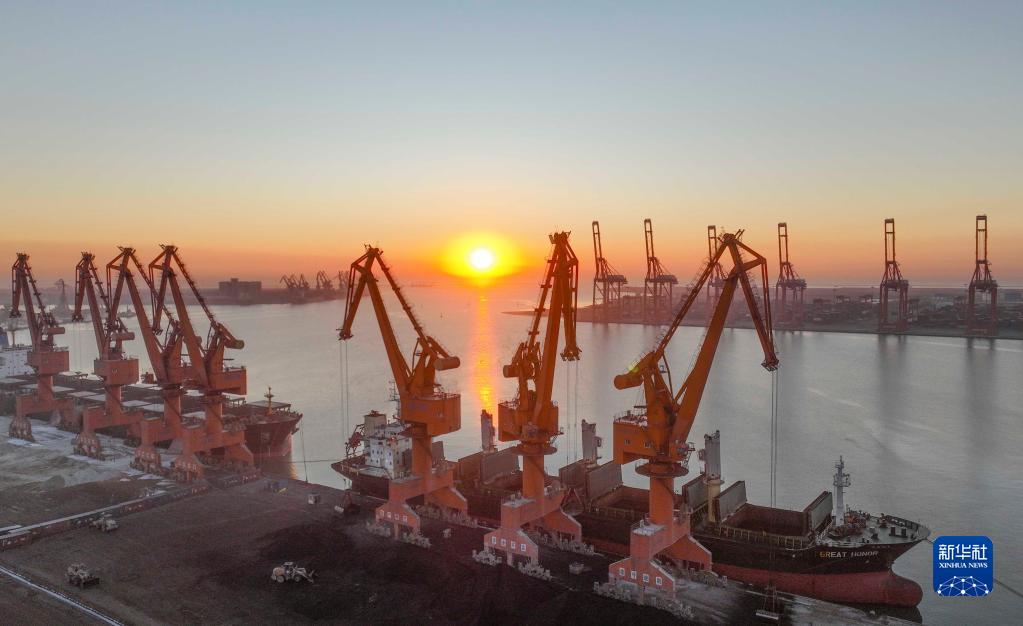 1月17日拍攝的唐山港京唐港區晨景(無人機照片)。