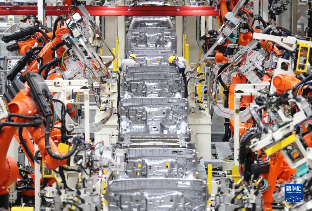 1月14日,在北京汽車制造廠青島總部基地的生產車間,機器人在焊接作業。