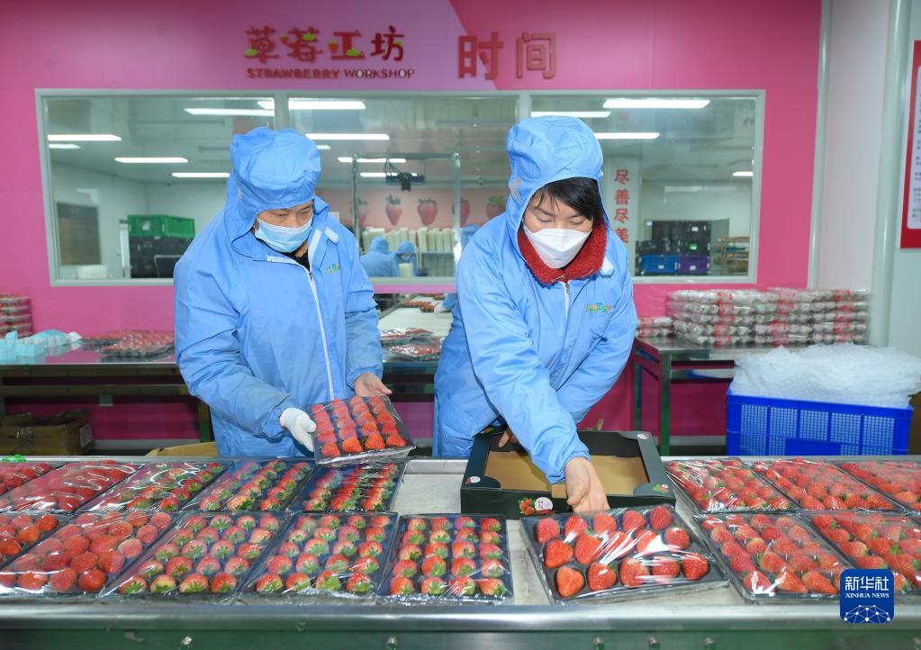 1月17日,浙江省建德市楊村橋鎮一家企業的工作人員在生產線上包裝草莓。