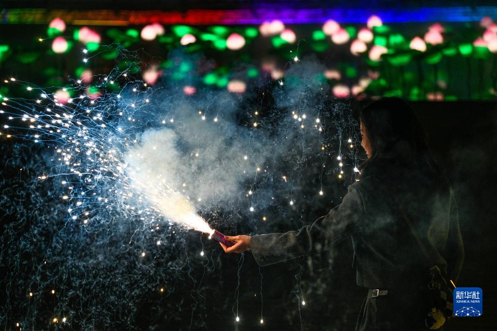 1月16日,市民在貴州省黔西南布依族苗族自治州興義市濕地公園燃放煙花。