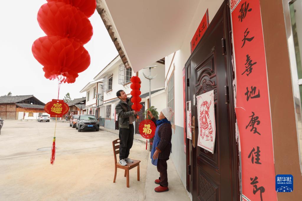 1月17日,村民在貴州省黔東南苗族侗族自治州劍河縣華潤希望小鎮掛燈籠。