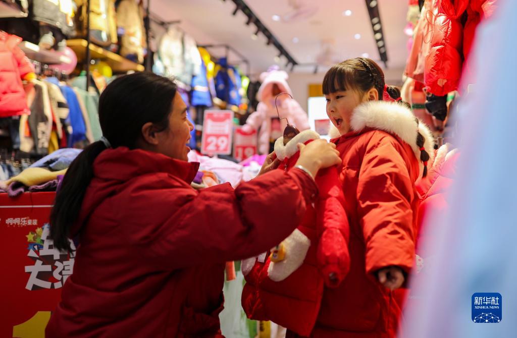 1月17日,在貴州省玉屏侗族自治縣,家長帶著小朋友在年集上購買新衣服。