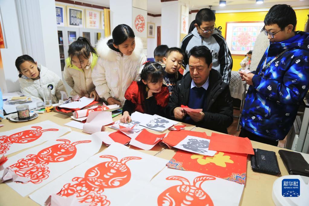 1月17日,在甘肅省定西市安定區文化館,剪紙傳承人教授學生創作生肖兔剪紙作品。