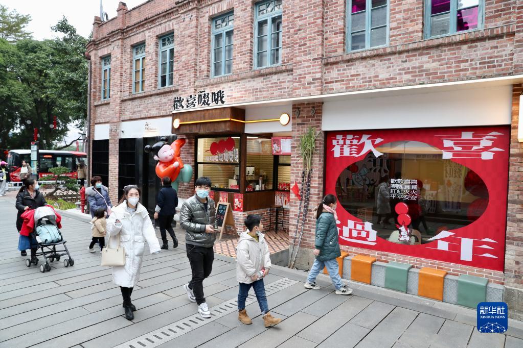 人們在福州煙臺山商業漫步街區游玩(1月16日攝)。
