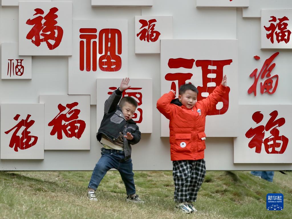 兩名小朋友在福州煙臺山公園福字墻前拍照(1月16日攝)。