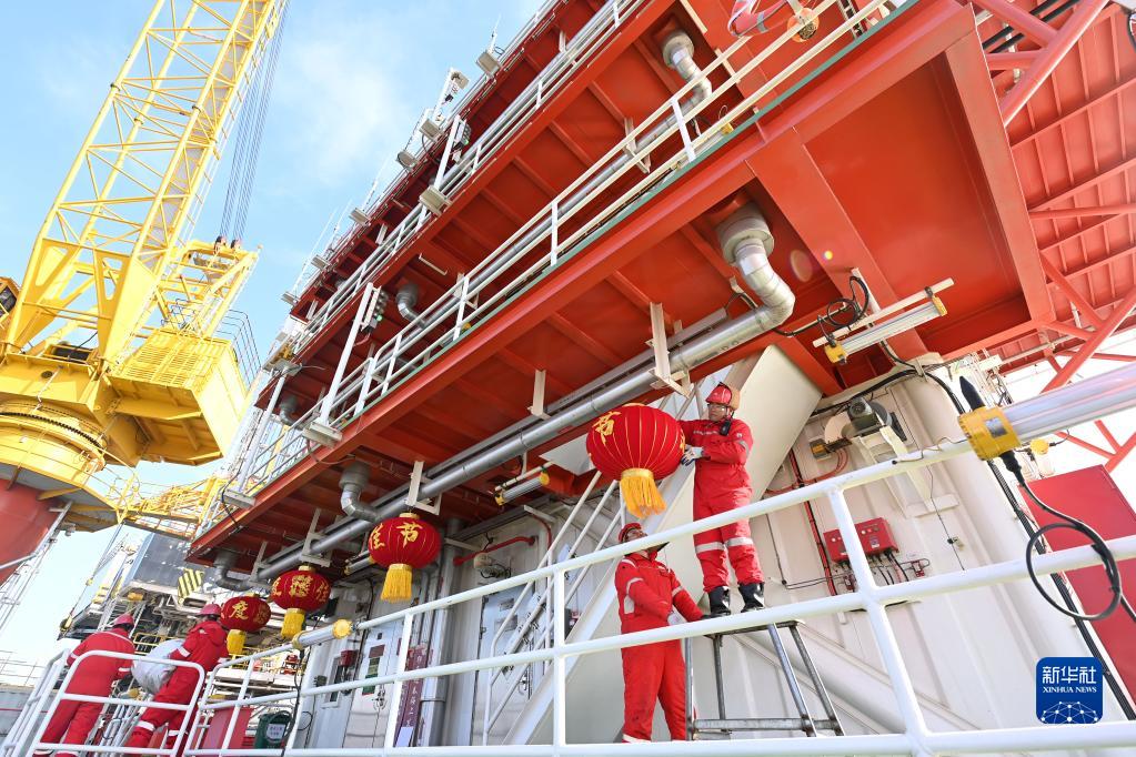埕海一號海上采油平臺工作人員在平臺生活區吊掛燈籠(1月16日攝)。