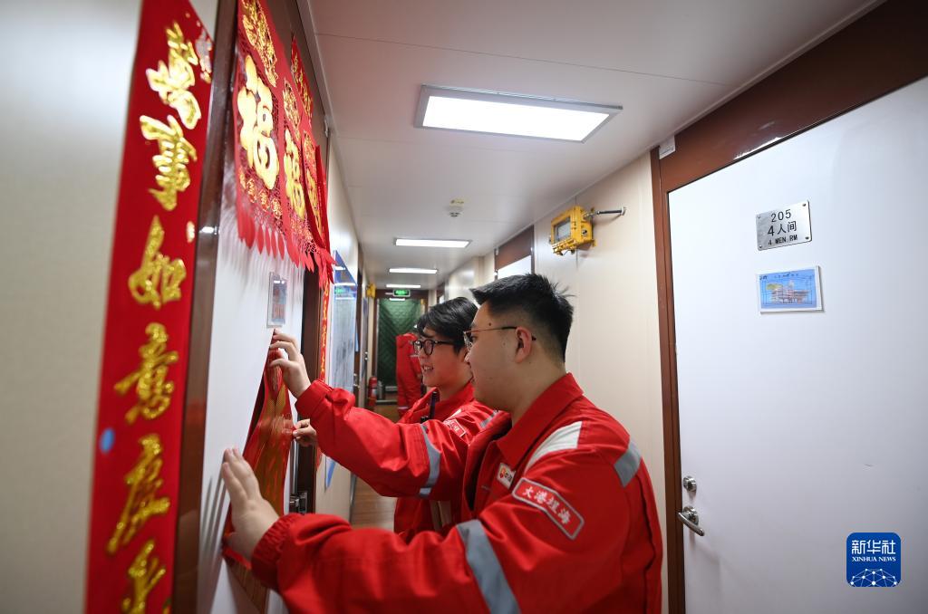 埕海一號海上采油平臺中控崗位員工聶虓宇(右)和同事將福字貼在宿舍門口(1月16日攝)。