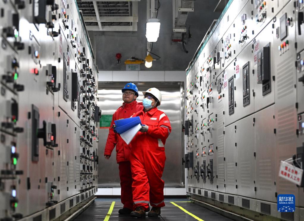 埕海一號海上采油平臺電氣工人在低壓配電室巡檢(1月16日攝)。