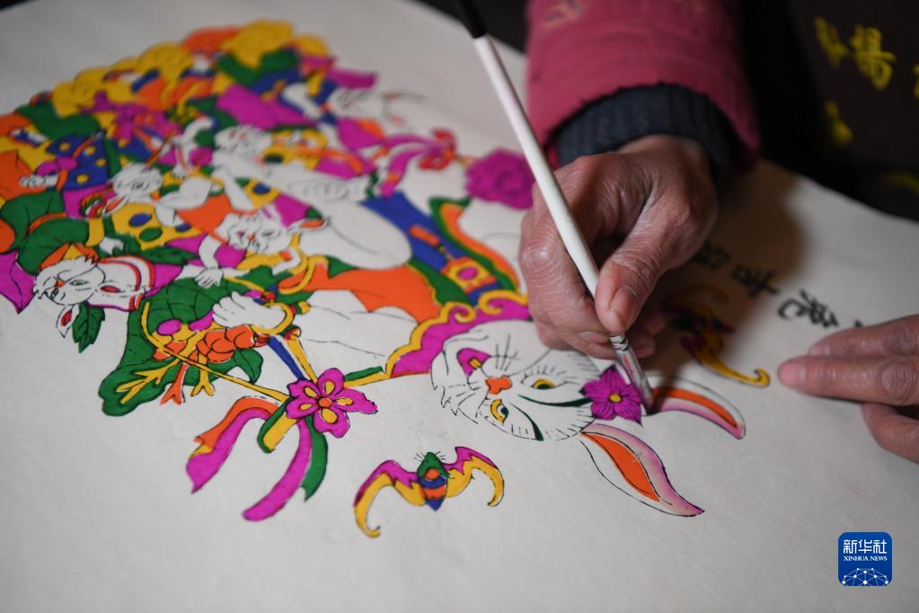 1月17日,在灘頭鎮福美祥年畫作坊,年畫藝人尹冬香在年畫上加入手繪使年畫更加靈動。