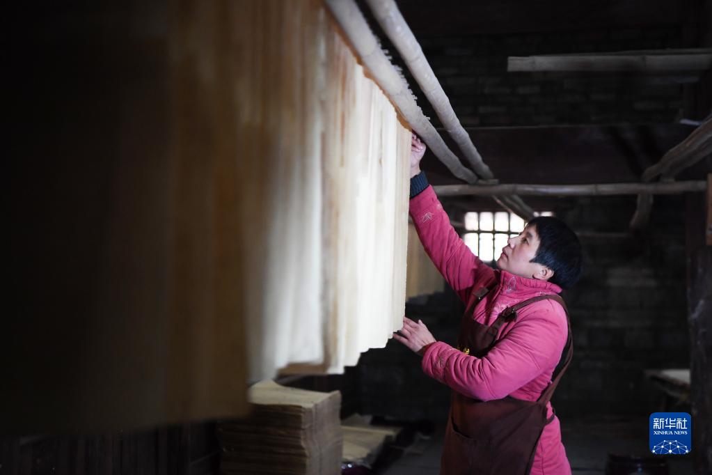1月17日,在灘頭鎮福美祥年畫作坊,年畫藝人尹冬香在晾紙。