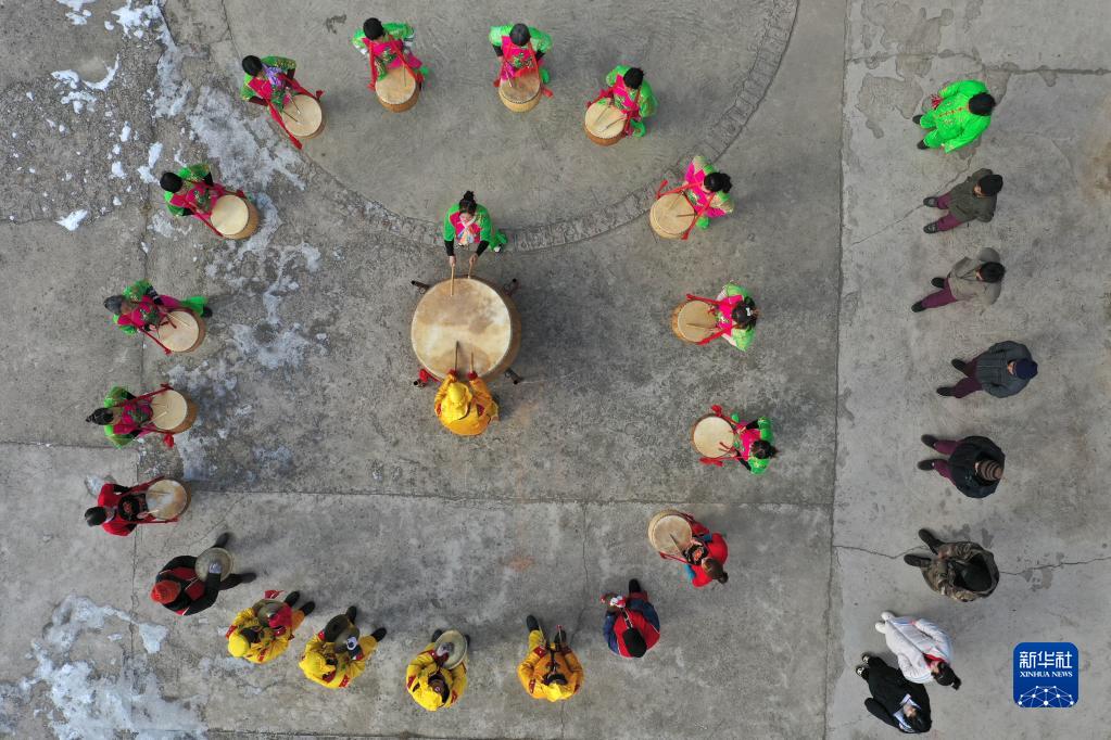 1月17日,內陽村村民排練“威風鑼鼓”節目(無人機照片)。